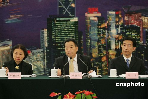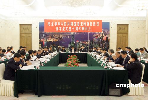 六月六日下午,纪念中华人民共和国香港特别行政区基本法实施十周年研讨会在北京人民大会堂举行,梁爱诗、乔晓阳、李飞主持会议。中新社发 毛建军 摄