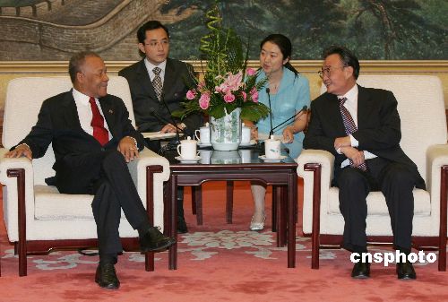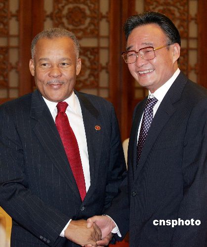 六月七日,中国全国人大常委会委员长吴邦国在北京人民大会堂会见来访的巴巴多斯总理欧文·阿瑟。中新社发 毛建军 摄