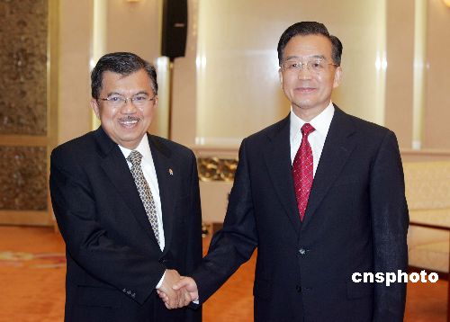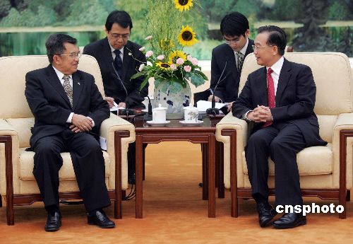六月八日,中国国务院总理温家宝在北京人民大会堂会见来访的印尼副总统尤素夫。中新社发 毛建军 摄
