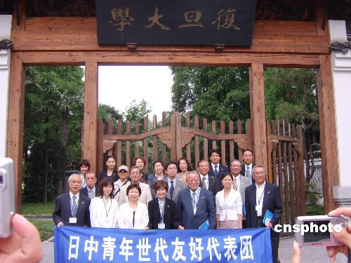 由日本前首相中曾根康弘率领的日中青年世代友好代表团6月15日“兵分十路”在上海开展考察活动,其中一个分团来到复旦大学参观访问,团员门在复旦大学老校门前合影。中新社发 刘田 摄