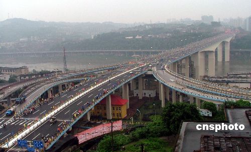| 重庆直辖十周年纪念日临近,6月16日,重庆嘉华大桥建成通车。该桥建成通车,将大大缓解主城江北、渝中、九龙坡等区交通拥挤状况。背景资料:重庆嘉华大桥双向8车道,总宽37.6米,为同类桥梁的“亚洲之最”;桥墩为薄壁箱型单墩,为全国同类桥梁首创;主跨252米,为同类桥梁全国第三;设计使用年限100年;整个工程总投资22亿元,于2004年12月29日开工,提前半年零11天竣工。中新社发 金城 摄