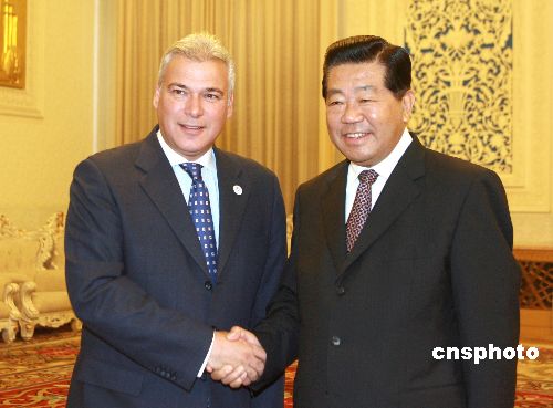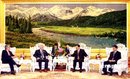 六月二十二日,全国政协主席贾庆林在北京会见欧盟经济社会委员会主席迪米特里亚迪斯。中新社发 廖文静 摄