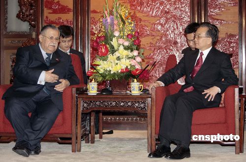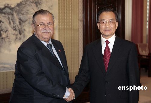 六月二十二日,中国国务院总理温家宝在北京会见来访的伊拉克总统塔拉巴尼。中新社发 盛佳鹏 摄