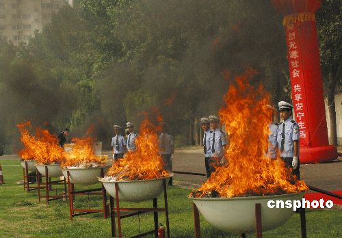 六月二十五日,河南省公开销毁近年来缴获的海洛因、鸦片、冰毒等各类毒品一百二十八千克。据介绍,二00五年以来,河南省强制戒毒七千八百余人、劳教戒毒二千二百人。河南省禁毒委员会负责人称,该省组织开展禁毒人民战争,取得了明显成效。中新社发 李志全 摄