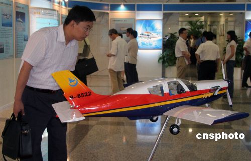 6月26日,中国国防科学技术工业委员会在北京组织召开的全国民用航空工业统计工作会议上称,“小鹰500”教练/通用飞机已经取得适航证,获得30架订单,150架意向订单,交付12架。图为在国防科工委同期举办的民用飞机成果展上,一位观众仔细察看“小鹰500”飞机模型。中新社发 孙自法 摄