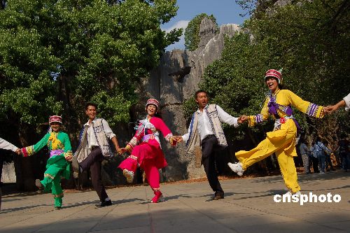 | 由云南石林、贵州荔波、重庆武隆共同组成的“中国南方喀斯特”世界自然遗产申报项目,6月27日在第三十一届世界遗产大会上获全票通过,成功地跻身于世界自然遗产之列。距昆明七十公里的石林风景区是云南旅游业的标识,其总面积约三百五十平方公里,是中国著名的旅游胜地,也是世界闻名的喀斯特地区之一,被人们赞誉为“天下第一奇观”。当喜讯从万里之遥的新西兰基督城传回石林时,当地各族群众激动万分,载歌载舞,欢庆这一历史性的时刻。