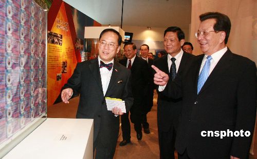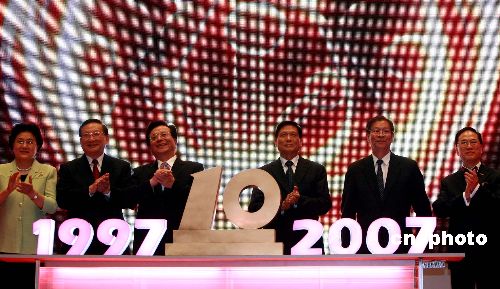 六月二十七日,香港回归十周年成就展在北京首都博物馆开幕。国家副主席曾庆红与香港特别行政区行政长官曾荫权等领导人共同出席了开幕式。中新社发 廖文静 摄