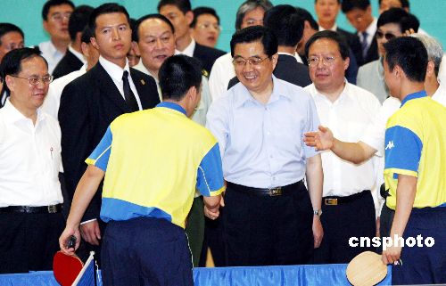 六月二十九日下午,中国国家主席胡锦涛在香港体育学院会见香港运动员,并与他们亲切交谈。中新社发 武仲林 摄