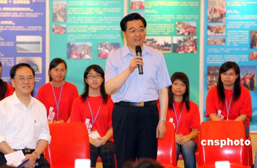 六月二十九日下午,中国国家主席胡锦涛在香港乌溪沙青年新村大礼堂参加“京港同心庆回归迎奥运”青少年交流会上讲话,鼓励大家努力学习,将来为香港、为祖国做贡献。中新社发 王丽南 摄