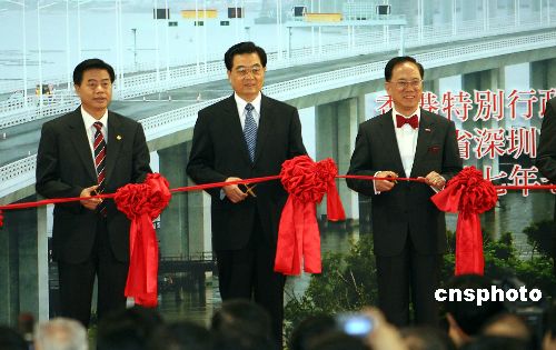七月一日,中国国家主席胡锦涛在香港出席深圳湾口岸开通仪式,胡锦涛主席、香港特首曾荫权、广东省省长黄华华等在仪式上剪彩。中新社发 洪少葵 摄