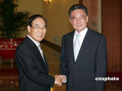 七月六日,北京人民大会堂,全国人大常委会委员长吴邦国与来访的韩国国会议长林采正举行会谈。中新社发 毛建军 摄