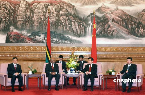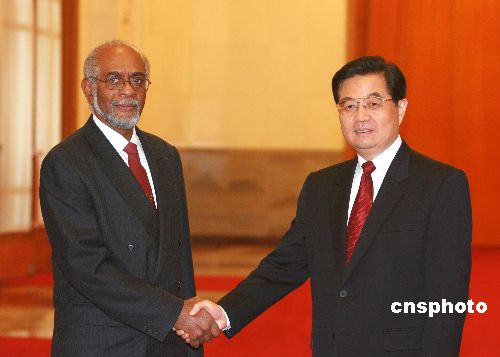七月九日,中国国家主席胡锦涛在北京人民大会堂主持仪式欢迎瓦努阿图共和国总统卡尔科特·马塔斯凯莱凯莱。中新社发 廖文静 摄