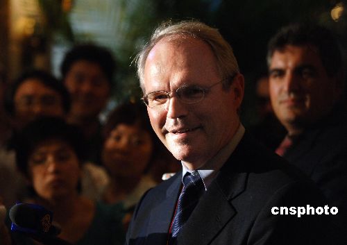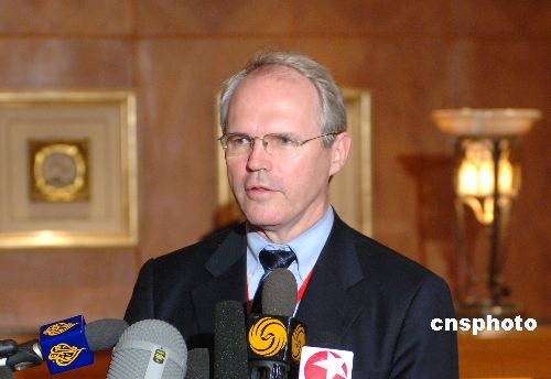 七月十八日,在北京举行的朝核问题六方会谈团长会结束后,美国代表团团长希尔在北京国际俱乐部接受记者采访。中新社发 廖攀 摄