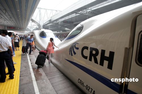 暑运开始后北京铁路客流猛增,七月二十七日从北戴河开往北京的D518次列车由两列六节车厢构成的动车组对接而成,形成每次开行十二节客运车厢的运力,应对旅游专线暑运高峰。中新社发 廖攀 摄