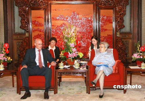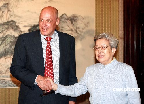 七月三十一日,中国国务院副总理吴仪在北京中南海紫光阁会见美国财政部长保尔森。中新社发 廖文静 摄