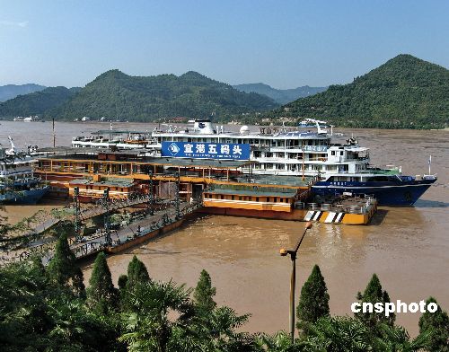 7月31日,长江宜昌段水位在52米设防线以上,三峡部分航道封航。三峡大坝环坝区,200余艘等待过闸的船舶靠泊锚地及码头。宜昌港组织了50多辆客车,对20余艘船舶的三峡旅客进行翻坝运输。图为湖北宜昌港船舶安全待航度汛。中新社发 韩玉洪 摄