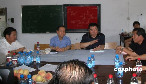 七月三十一日,“八一”建军节到来之际,国家安全生产监督管理总局局长李毅中(中左)、河南省省长李成玉(中右)等在河南省武警总队政委刘生辉的陪同下,来到河南陕县矿难堵水现场,看望慰问参加抢险的武警官兵。李毅中说,出现险情以后,武警部队三门峡支队和洛阳支队迅速赶到现场,担负了最艰巨最重要的任务千方百计堵住水源,三百多名官兵在现场在暴雨中有力地保持了泄露地方填充和密闭的完好,为抢险工作奠定了基础,再次向大家表示衷心的感谢。中新社发 刘文辉 摄