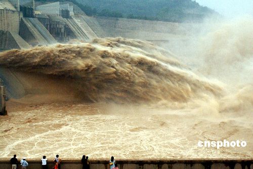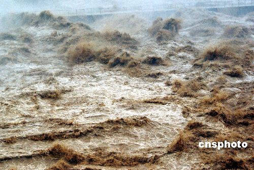 8月3日,混浊的水流从黄河小浪底水库3个排沙洞涌出,黄色“巨龙”在小浪底咆哮喷涌。自8月2日起,黄河防总启动汛期调水调沙运行机制。这是黄河首次在同一年度两次实施调水调沙。汛期调水调沙预计8月6日结束。据介绍,2007年汛前的调水调沙,是通过水库联合调度用“人造洪峰”冲刷下游河道,此次调水调沙则是通过调度天然洪水实现减淤目标。中新社发 平白 摄