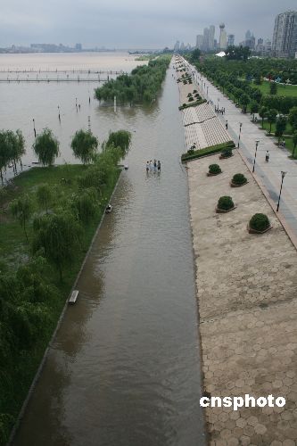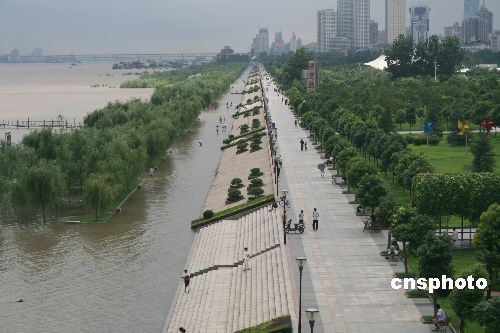 受长江上游持续强降雨及三峡洞庭湖来水的影响,截至8月4日,长江武汉关水位连续11天缓涨,汉口江滩一期4.5公里亲水平台全部被淹。中新社发 李长林 摄