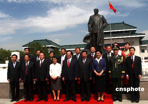 为庆祝内蒙古自治区成立60周年,中央赴内蒙古自治区代表团团长曾庆红一行8月9日在呼和浩特市参观乌兰夫纪念馆,尔后兴致勃勃地与当地工作人员合影留念。中新社发 赵振清 摄