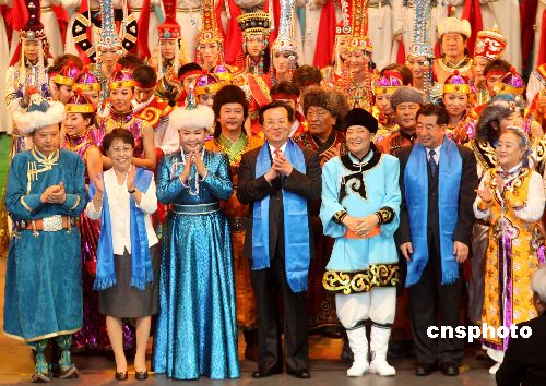 8月9日晚,庆祝内蒙古自治区成立60周年文艺晚会《草原上升起不落的太阳》在内蒙古乌兰恰特隆重举行。中央代表团团长曾庆红、副团长回良玉、乌云其木格、刘延东、白立忱、李继耐和中央代表团全体成员,以及曾经在内蒙古工作过的布赫等老同志观看演出并与演员同声高唱《歌唱祖国》。中新社发 赵振清 摄