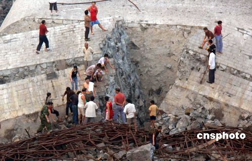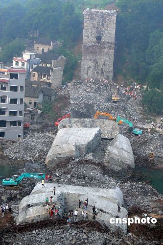 湖南凤凰县正在兴建中的堤溪沱江大桥于13日下午4时许发生突然垮塌事故。截至14日晚上,已成功救出遇险人员64人,其中22人受伤;已确认有29人在事故中遇难。据悉,该大桥是在拆除脚手架时发生事故,计划8月底竣工。图为全部跨塌后的桥梁现场。中新社发 文兵 摄