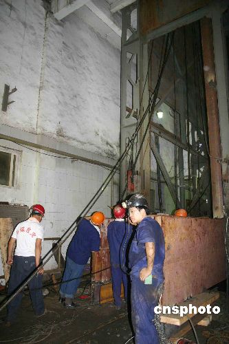 来自各地的救援排水设备陆续运抵山东新泰溃水煤矿,图为支援排水的中煤集团救援人员正在与溃水煤矿——华源矿业公司的技术人员一起加固主矿井井架,以便安装重达八十吨以上的排水设备。中新社发 彭红 摄