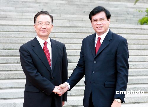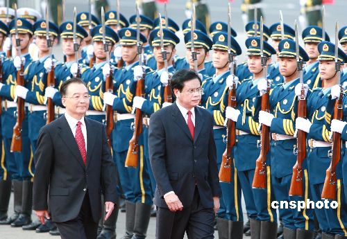 八月二十三日,中国国务院总理温家宝在北京人民大会堂东门外广场主持仪式欢迎老挝政府总理波松·布帕万。中新社发 廖文静 摄