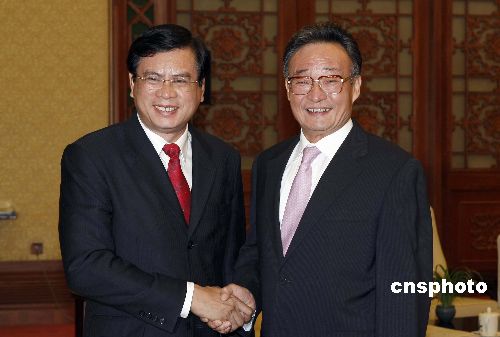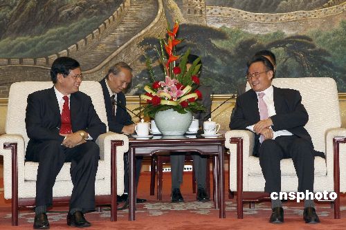 八月二十四日,全国人大常委会委员长吴邦国在北京人民大会堂会见老挝政府总理波松·布帕万。中新社发 盛佳鹏 摄