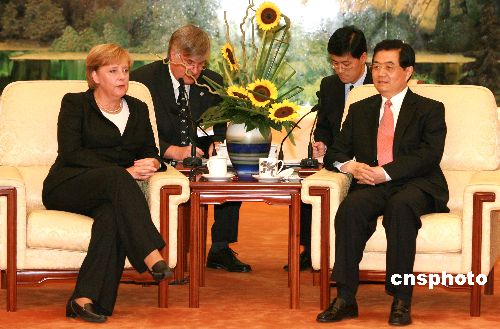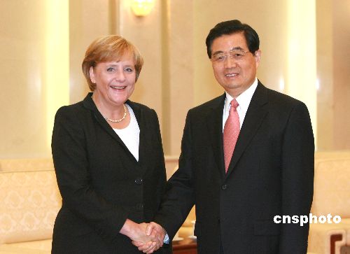八月二十七日,中国国家主席胡锦涛在北京人民大会堂会见德国总理默克尔。中新社发 廖文静 摄