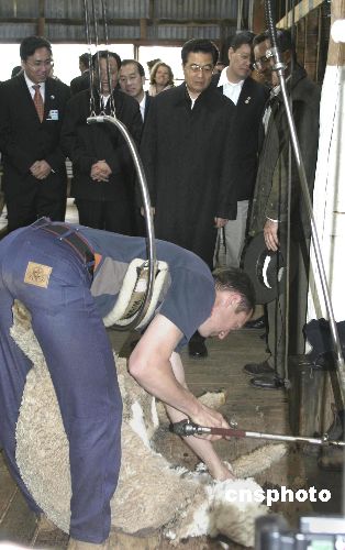九月五日,中国国家主席胡锦涛参观澳大利亚堪培拉附近的一家牧场时,观看剪羊毛表演。中新社发 赖海隆 摄