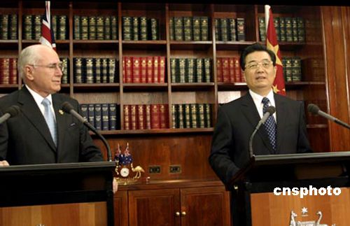 中国国家主席胡锦涛九月六日在悉尼与澳大利亚总理霍华德参加签字仪式后共同会见记者。中新社发 赖海隆 摄