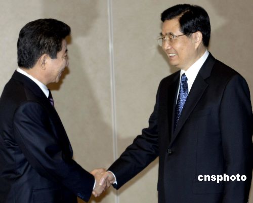 中国国家主席胡锦涛七日上午在悉尼会见出席亚太经济合作组织第十五次领导人非正式会议的韩国总统卢武铉。中新社发 赖海隆 摄