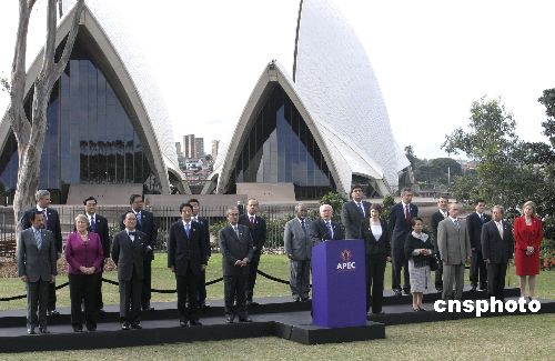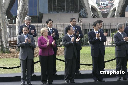 九月九日下午,APEC第十五次领导人非正式会议结束,中国国家主席胡锦涛与其它二十名经济体成员领导人,共同出席在悉尼歌剧院草坪上举行的简短闭幕仪式。中新社发 赖海隆 摄