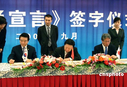 首届中日韩文化部长论坛今天在中国长江口的港口城市南通举行,韩国文化观光部长官金钟民、日本文化厅长官青木保和中国文化部部长孙家正举出席会议,并签署了《南通宣言》。中新社发 丁梅 摄