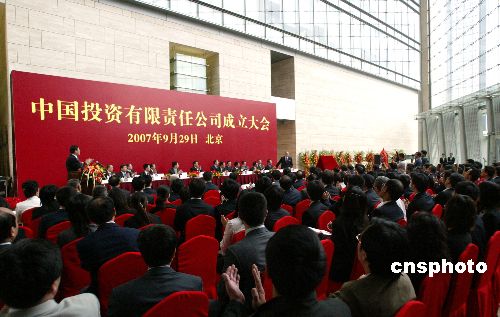 经国务院批准,中国投资有限责任公司(中投公司)于9月29日在北京成立。国务院副秘书长张平、财政部部长谢旭人、中国人民银行行长周小川等相关领导出席公司成立大会。中投公司是依据《公司法》设立的国有独资公司,公司注册资本两千亿美元。中投公司从2007年3月份开始筹备,目前各项工作已基本就绪。楼继伟出任公司董事长,高西庆任总经理,胡怀邦任监事长。中投公司当前所从事的外汇投资业务以境外金融组合产品为主。公司将实行政企分开、自主经营、商业化运作,在可接受的风险范围内,实现长期投资收益最大化。中新社发 杨可佳 摄