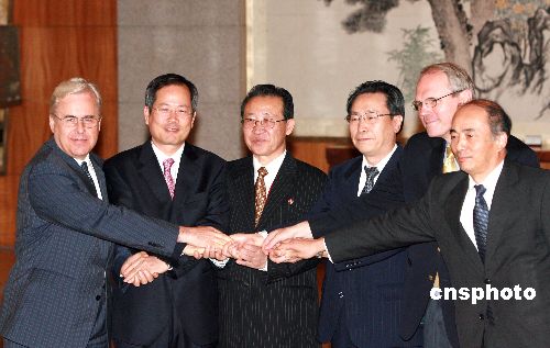 九月三十日下午,中方代表团团长、外交部副部长武大伟在北京钓鱼台宣布:第六轮六方会谈第二阶段会议休会两天。图为俄罗斯代表团团长洛修科夫、韩国代表团团长千英宇、朝鲜代表团团长金桂冠、中国代表团团长武大伟、美国代表团团长希尔、日本代表团团长佐佐江贤一郎(左至右)合影留念。中新社发 廖文静 摄