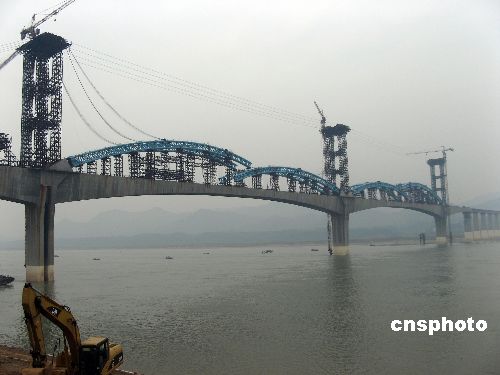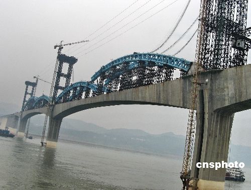 10月10日,宜万铁路宜昌大桥两个跨度为275米的巨型钢管拱已被安放到桥面,即将开始对接。该桥为连续钢构柔性拱组合孔跨,其连续的钢构部分跨径275米,是目前世界同类型铁路桥梁中跨度最大的、技术含量最高的大桥。据了解,宜万铁路宜昌大桥原设计为过江隧道,为不影响中华鲟洄游产卵,才改设计为跨江铁路大桥。中新社发 韩玉洪 摄