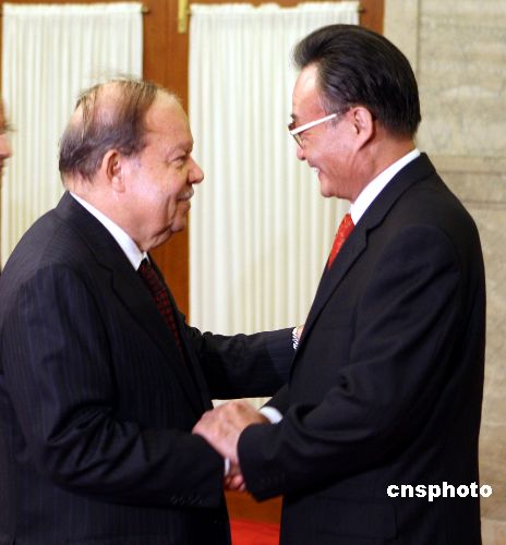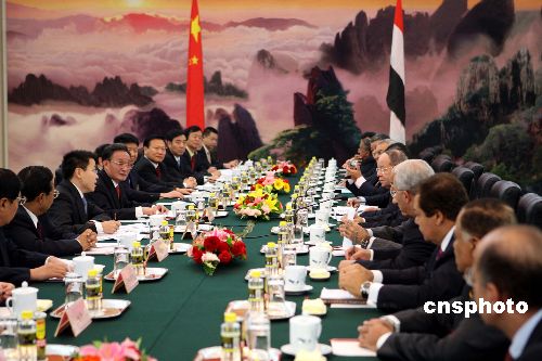十月二十四日,吴邦国委员长在北京人民大会堂会见由埃及人民议会议长苏鲁尔率领的代表团并主持会谈正式启动双方交流机制。中新社发 任海霞 摄