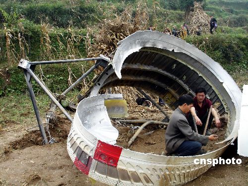 10月24日18时05分,在西昌卫星发射中心发射的“嫦娥一号”卫星,任务代号“07——34”,一级火箭残骸成功着落于贵州福泉道坪镇上平果村民组。残骸 外壳着落于该村民组玉米地面,残骸着落于一吴姓村民房屋中梁,全村民无人受伤。目前相关部门正在组织人员拆卸回收。中新社发 易胜武 摄
