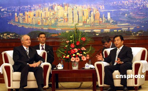 10月25日,重庆市长王鸿举会见来渝参加第四届“中法市长圆桌会议”的法国市长代表团一行。据介绍,“中法市长圆桌会议”是由中法两国元首倡议于2004年创设,由中国人民外交学会和法国法中委员会共同组织,每年轮流在两国举办。会议主要围绕城市规划和建设、可持续发展等主题进行研讨,并就中法城市间的交流合作建设进行商洽。图为王鸿举(右一)与法国巴黎市副市长、会议法方主席克里斯蒂安·索泰(左一)亲切交谈。中新社发 郭晋嘉 摄