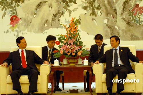 十月二十八日,出席第四届中国—东盟博览会的越南总理阮晋勇,当天晚间在与中共广西壮族自治区委员会书记刘奇葆会见时说,他鼓励更多的越南企业利用博览会打开中国的市场。中新社发 蒋雪林 摄