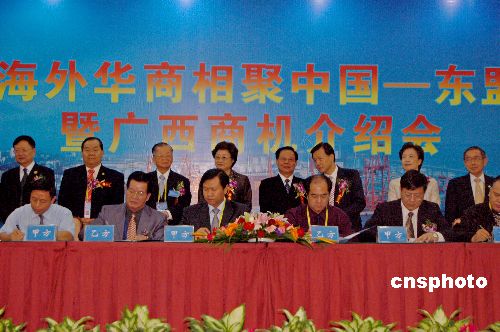 十月二十九日,二〇〇七海外华商相聚中国—东盟博览会暨广西商机介绍会在广西南宁举行,两百名华商参加会议,会上签约十八个项目,金额三点八六亿美元。中新社发 刘万强 摄