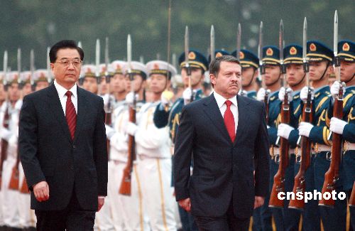 十月三十日,中国国家主席胡锦涛在北京人民大会堂东门外广场举行仪式欢迎约旦国王阿卜杜拉二世·本·侯赛因。中新社发 廖文静 摄