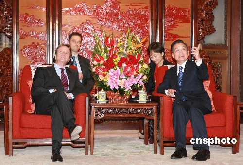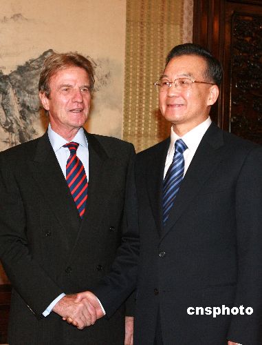 十月三十一日,中国国务院总理温家宝在北京会见法国外交部部长贝尔纳·库什内。中新社发 廖文静 摄