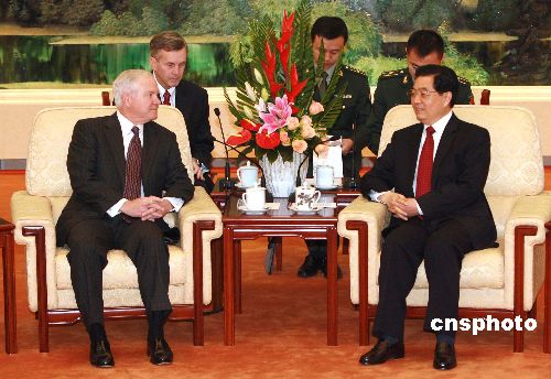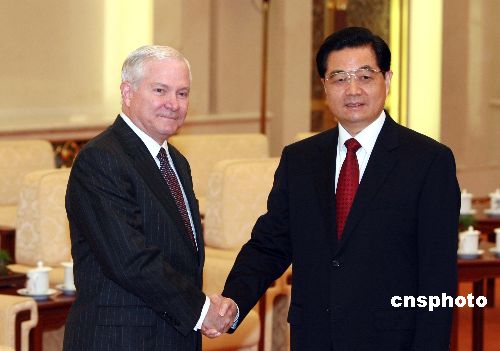 十一月六日,中国国家主席、中央军委主席胡锦涛在北京人民大会堂会见美国国防部长罗伯特·盖茨。中新社发 廖文静 摄