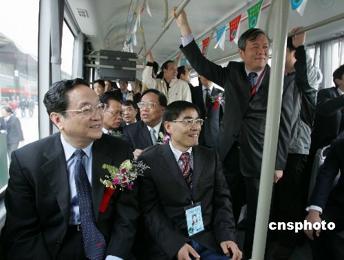 十一月六日,中共中央政治局委员、上海市委书记俞正声(左)视察“2007中国国际工业博览会”,并乘坐新能源公共汽车。据悉,这是俞正声履新上海后,首次出席大型公众活动。中新社发 潘索菲 摄