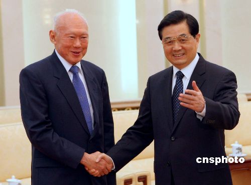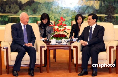 十一月十六日,中国国家主席胡锦涛在北京人民大会堂会见来访的新加坡内阁资政李光耀。中新社发 任海霞 摄