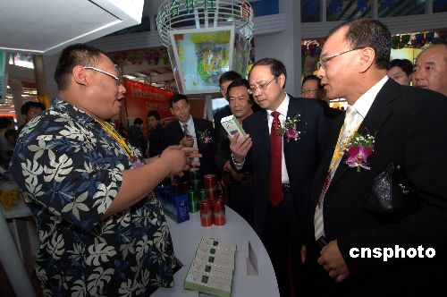 十一月十八日,台湾商人陈志惟(左一)在闽台农业合作成果馆里向国务院台办副主任郑立中(右二)介绍自己的产品。当日,第九届海峡两岸(福建漳州)花卉博览会暨农业合作洽谈会在福建漳州花博园开幕。中新社发 王东明 摄