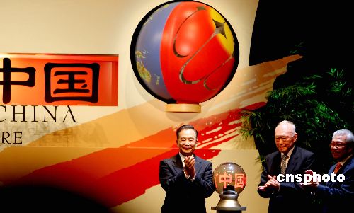 在新加坡内阁资政李光耀的倡议和带动下,新加坡中华总商会成立了“通商中国”组织,致力搭建促进中新两国文化和工商界交流的务实新平台。对此新举,中国也给予了积极回应。中国国务院总理温家宝十九日在新加坡大学演讲时表示,中国希望“通商中国”为中新关系发展开创新的天地。图为温家宝总理在演讲前,与新加坡内阁资政李光耀共同参与“通商中国”启动仪式。中新社发 周群 摄